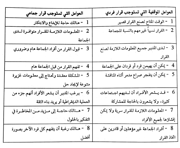 الجدول التالي يوضح العوامل الموقفية التي تستوجب القرار الفردي + الجماعي